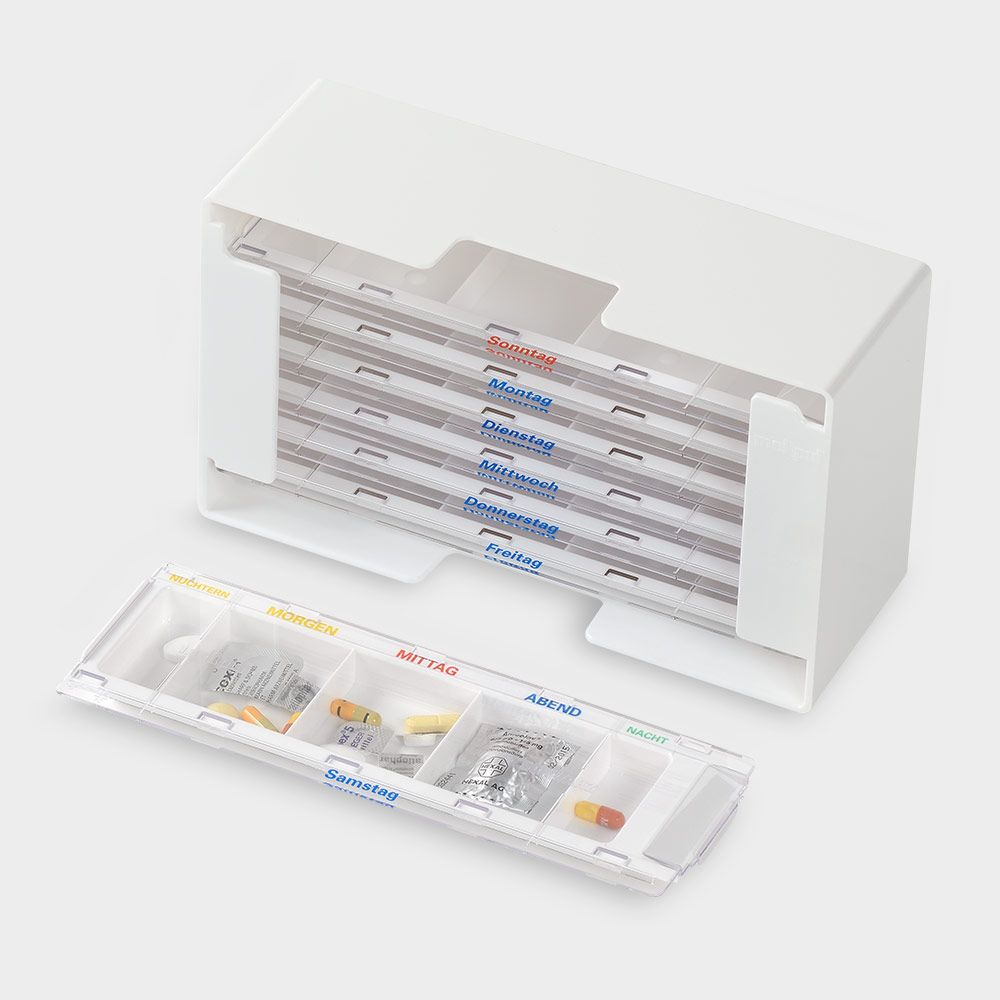 Die übersichtliche und sichere Organisationshilfe, wenn die Medikation für 1 Woche vorbereitet wird. In der Dispenserbox aus Polystyrol (PS) sind 7 Dispenser gestapelt. Aus der unteren Öffnung wird der aktuelle Wochentag entnommen, in die Obere der vergangene Tag wieder einsortiert. Die stabilen, kompakten Dispenser aus hochwertigem Kunststoff (PC) mit einem zusätzlichen Fach für die “Nüchtern“ Medikation ermöglichen problemloses Befüllen, einfache Kontrolle und ein leichtes Entnehmen der Medikamente. Farbige Kennzeichnung der Tageszeiten und deutliche Beschriftung ist im Besonderen für ältere Menschen gut wahrnehmbar. Der glasklare Schiebedeckel mit dem Aufdruck des jeweiligen Wochentages verrastet sicher mit dem Unterteil, ein ungewolltes, selbstständiges Aufschieben ist dadurch nicht möglich. Deckel und Unterteil können problemlos in der Spülmaschine gereinigt werden.